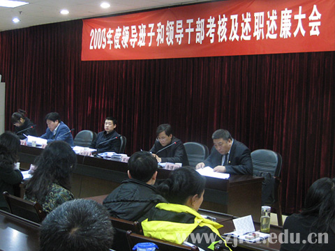 童学敏书记代表学院领导班子作了2009年度述职述廉报告。他指出,2009年,在省委教育工委、省供销社党委的正确领导下,学院深入学习实践科学发展观,紧紧围绕省级示范性项目建设工作,紧密结合学院改革发展实践,以学院第一次党代会的召开为契机,解放思想、实事求是、锐意创新,全面推进学院各项建设,较好地完成了各项年度工作任务。童书记主要从五个方面对学院取得的成绩作了汇报,一是深入学习实践科学发展观活动有序开展,党建和思想政治工作取得明显成效;二是加强院系领导班子建设,整体素质和能力明显增强;三是抓紧省级示范性院校项目建设,学院教学改革和内涵建设深入推进有成效;四是切实转变学生管理理念,学生管理工作主动、服务到位;五是深化校园文化建设,文明单位、平安校园常态化工作机制运转有效。童书记同时指出,在取得较大成绩和进步的同时,应该看到我们的工作存在不少问题和困难,我们还要付出更多的努力。最后童书记指出,2010年,学院将接受省级示范性高职学院建设项目的中期检查,这既是一个严峻的挑战和考验又是一次发展的良好机遇,我们必须增强克难攻坚的信心,以建设学习型党组织为抓手,以建设省级示范性高职学院为契机,以建设和谐校园为载体,坚持以人为本,完善依法治校,加强民主管理,凝众心聚合力,推进学院科学和谐发展。