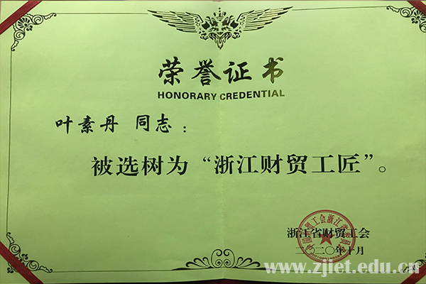 近日,中国财贸工会浙江省委员会在杭州召开2020年“浙江财贸工匠”学习推进会,通报表彰了50位新晋“浙江财贸工匠”。我校应用工程系叶素丹教授荣获“浙江财贸工匠”荣誉称号。