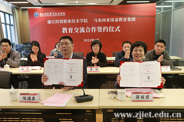 4月7日下午,学校与马来西亚深斋教育集团交流合作签约仪式在教师发展中心举行。学校校长陈德泉、副校长蒋丽君,马来西亚深斋教育集团执行董事胡恩林,首席执行官杨锡水,康博国际学院校长阿末占利博士,深斋技术职业学院副校长阿滋祖易茂出席仪式。签约仪式以线上视频会议方式举行,由国际交流与合作中心主任王春青主持。