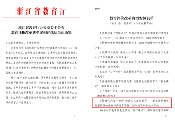 近日,浙江省教育厅办公室公布2020年度教育评价改革典型案例评选结果,我校报送的案例“培育人人奋斗精神 创造人人出彩机会——彰显高职教育类型特征的教育评价改革实践”入选。此次案例评选旨在贯彻落实《深化新时代教育评价改革总体方案》,大力营造主动探索、奋勇争先的良好改革氛围。经专家评审,从86个案例中评选出教育评价改革典型案例31个,我校作为高职院校典型案例报送到教育部,这是学校教育评价改革实践取得的成效,更是对学校教育质量保障体系建设工作的肯定。