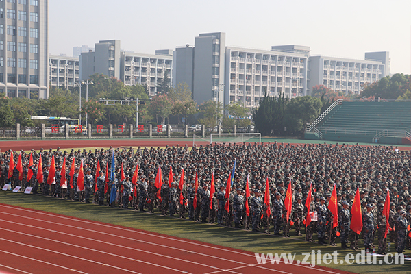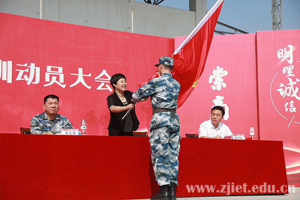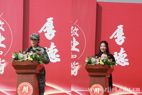 大会上,主席台领导为新生代表佩戴校徽,对新生表示祝贺。副校长蒋丽君为军训团授旗。新生代表、国际贸易学院应用英语专业闫乐玟,老生代表、工商管理学院付静,教师代表、信息技术学院邹玉金,军训教官代表、94973部队王爱云分别发言。