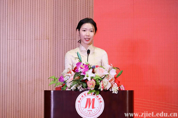 浙农集团股份有限公司人力资源部经理钟尧君作企业代表发言,介绍了与学校合作的农资订单班、汽车定向班、庄稼医生培训鉴定、智慧农资培训课程开发、大学生实训基地等项目,并对公司未来技能人才的培养生态、职业发展体系和学习发展体系提出了设想和规划,鼓励更多毕业生投身乡村振兴事业,加盟供销社企业共同奋斗。合作经济学院茶艺与茶叶营销专业周粤虹作毕业生代表发言,她畅谈了三年的学习经历,主动将个人理想融入供销社行业发展,积极投身于现代化农业事业,展示了“新时代供销人”积极进取、勇于担当的精神和良好的风貌。