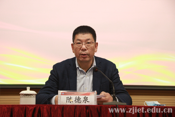 陈德泉总结了学校党史学习教育开展情况,他表示,自党史学习教育开展以来,学校党委把党史学习教育作为贯穿全年的重要政治任务,在省委党史学习教育第十三巡回指导组和省供销社党委的有力指导下,聚焦六个“突出”,六个“抓实”,即:突出“责任落实”,抓实“组织领导”;突出“学深悟透”,抓实“专题学习”;突出“全面覆盖”,抓实“专题宣讲”;突出“氛围营造”,抓实“专题宣传”;突出“服务惠民”,抓实“专题实践”;突出“问题导向”,抓实“专题整改”,多措并举推动党史学习教育扎实落地、走深走实。通过这一年的党史学习教育,全校师生受到了一次全面深刻的政治教育、思想淬炼、精神洗礼,在学史明理中增强了政治自觉,在学史增信中坚定了信仰信念,在学史崇德中锤炼了政治品格,在学史力行中激发了使命担当,学校各项事业取得了新进展,达到了学党史、悟思想、办实事、开新局的目的。