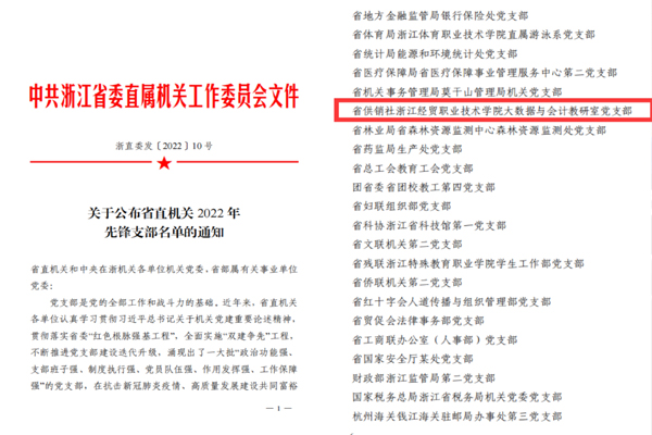 近年来,大数据与会计教研室党支部根据教育部提出的“七个有力”建设要求,锚定支部自身“六个样板”建设目标,全体党员勠力同心,将党建渗透业务,把业务融入党建,取得了党建与业务“两促进、双提高”的显著成效。2020年获得浙江省供销社先进党组织荣誉称号,2021年获得浙江省高校先进基层党组织荣誉称号,2022年6月顺利通过了教育部第二批新时代高校党建示范创建和质量创优工作样板支部的验收。