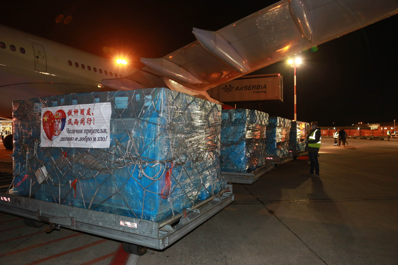 在塞尔维亚首都贝尔格莱德,写有“铁杆朋友,风雨同行”字样的中方捐赠医疗物资从飞机上卸下(2020年3月21日摄)。新华社记者 石中玉 摄