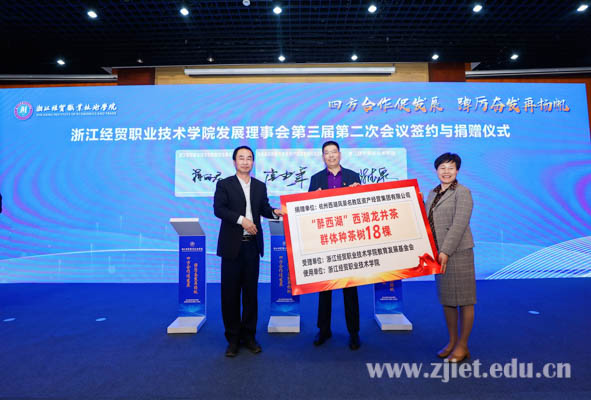 会上,学校与绍兴市上虞区供销合作总社、平湖市供销合作社联合社、浙江方圆检测股份有限公司、厦门网中网软件有限公司、浙江星汉信息技术股份有限公司、北京京东乾石科技有限公司等6家单位签订了校社、校企战略合作协议。与浙江省兴合集团有限责任公司、杭州西湖风景名胜区资产经营集团有限公司举行签约及捐赠仪式,两家合作单位分别向学校教育发展基金会捐赠人民币伍佰万元、“醉西湖”西湖龙井茶群体种茶树18棵。