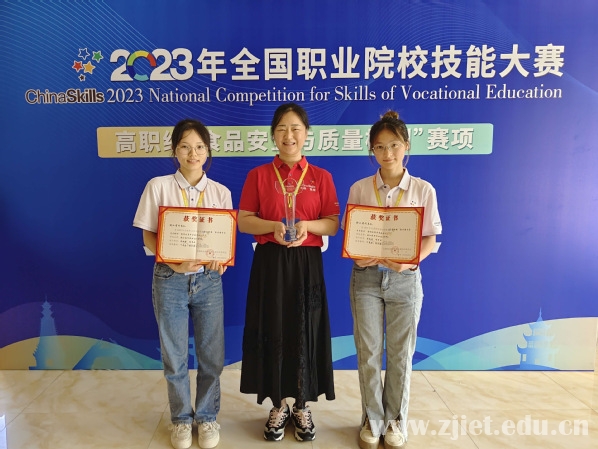 8月16-20日,2023年全国职业院校技能大赛高职组“食品安全与质量检测”赛项在贵州省贵阳市贵州农业职业学院举行,来自全国30个省市、新疆生产建设兵团的60支参赛队,共计120名选手参加。我校应用工程学院食品检验检测技术专业群学生蔡淑婷、谢菁婷组成的浙江省代表队精心备战、发挥出色,荣获了团体一等奖。