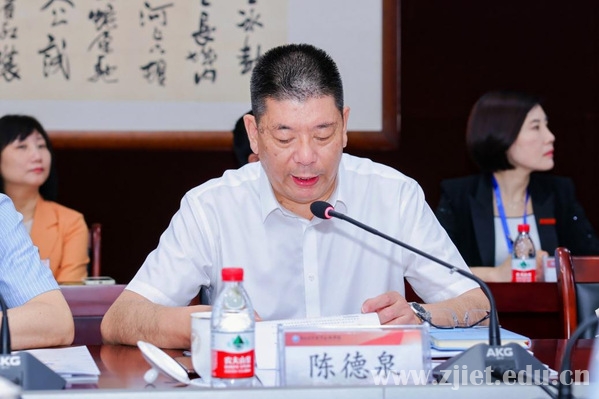 陈德泉代表学校作题为“提档升级 赋能增效 高质量贡献经贸力量”的项目建设汇报。他从总体情况、举措成效、特色经验、思考展望等四方面进行了重点汇报。食品检验检测技术专业群叶素丹院长作高水平专业群建设汇报。
